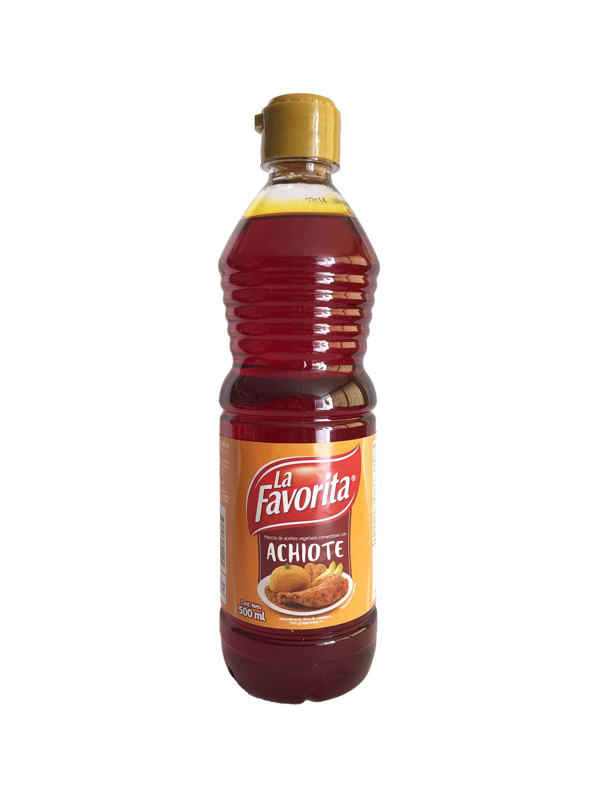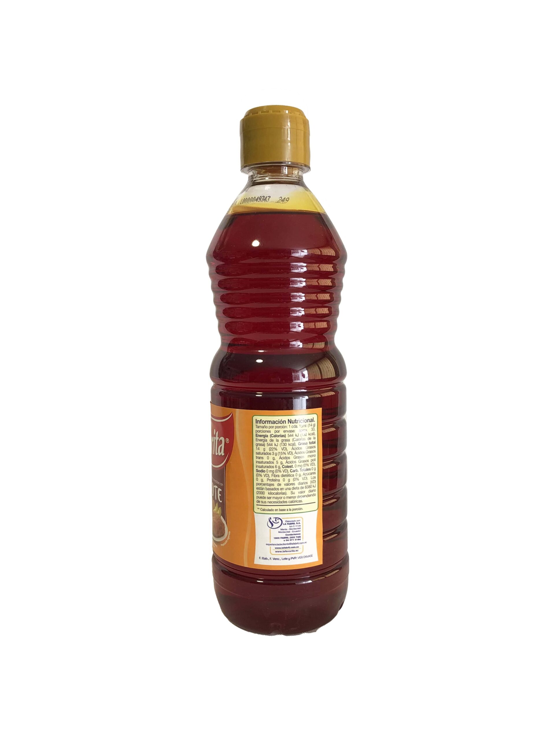Aceite vegetal con achiote marca La Favorita, botella de 500ml