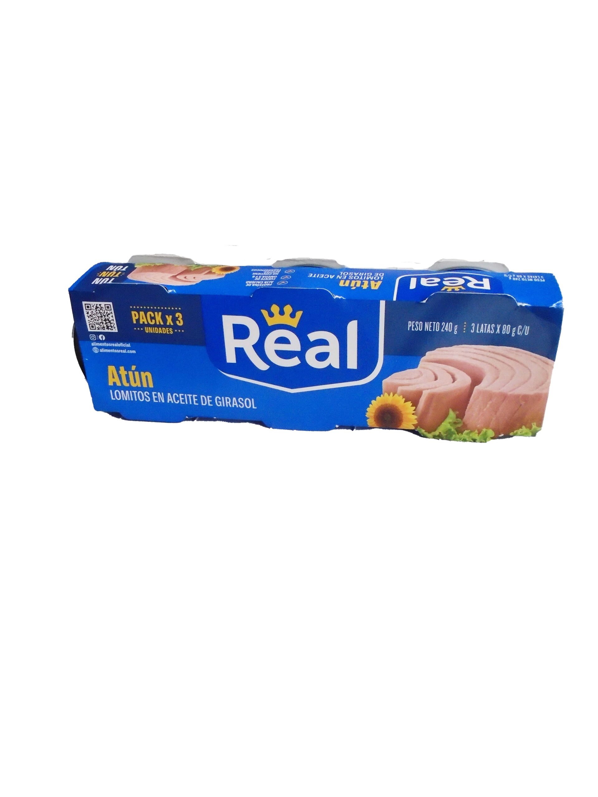 Atún en lomitos en aceite de girasol marca Real 3u de 80g, pack 240g