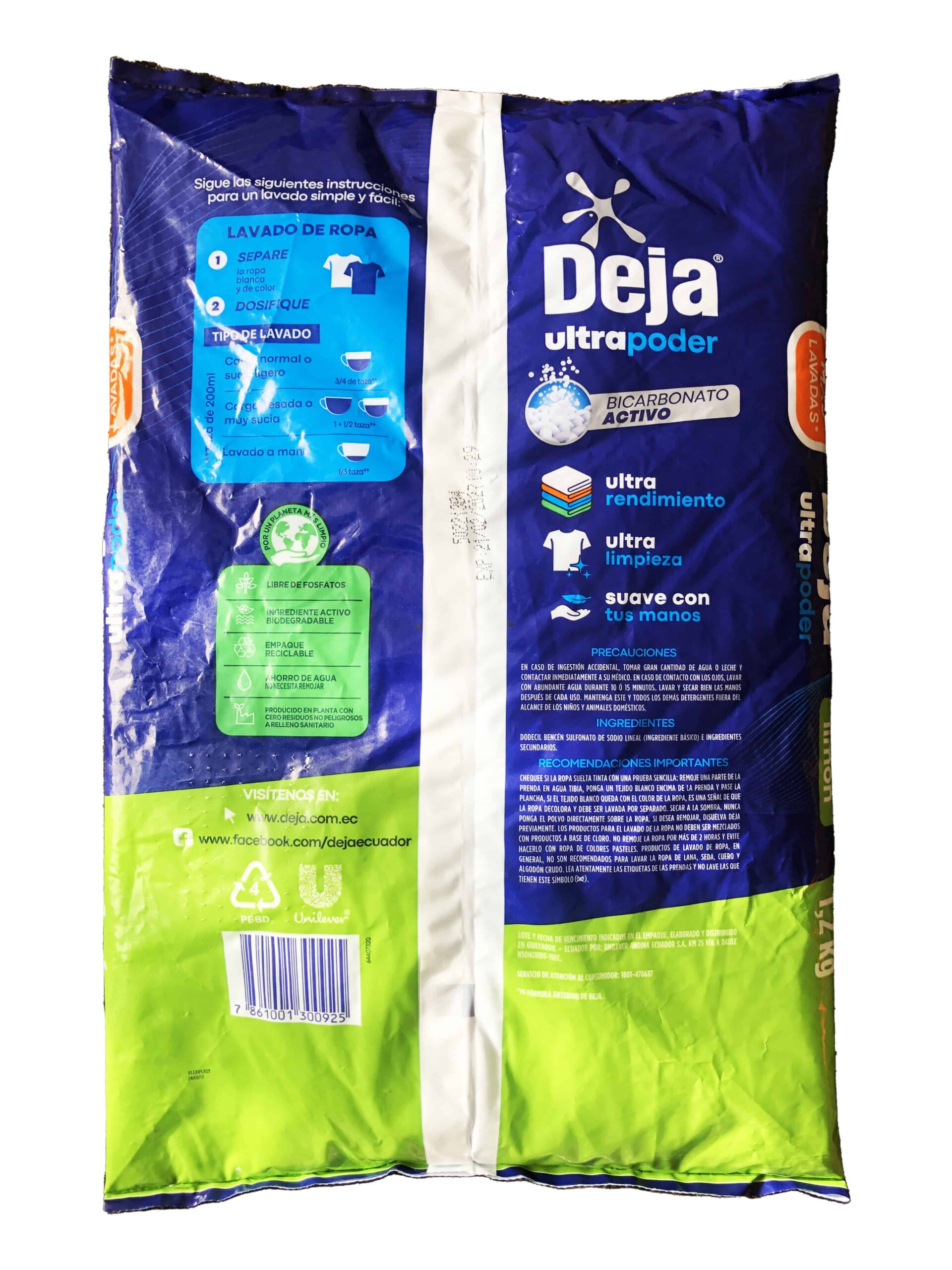 Detergente en polvo marca Deja Ultrapoder con bicarbonato activo, aroma a limón; funda de 1.2Kg