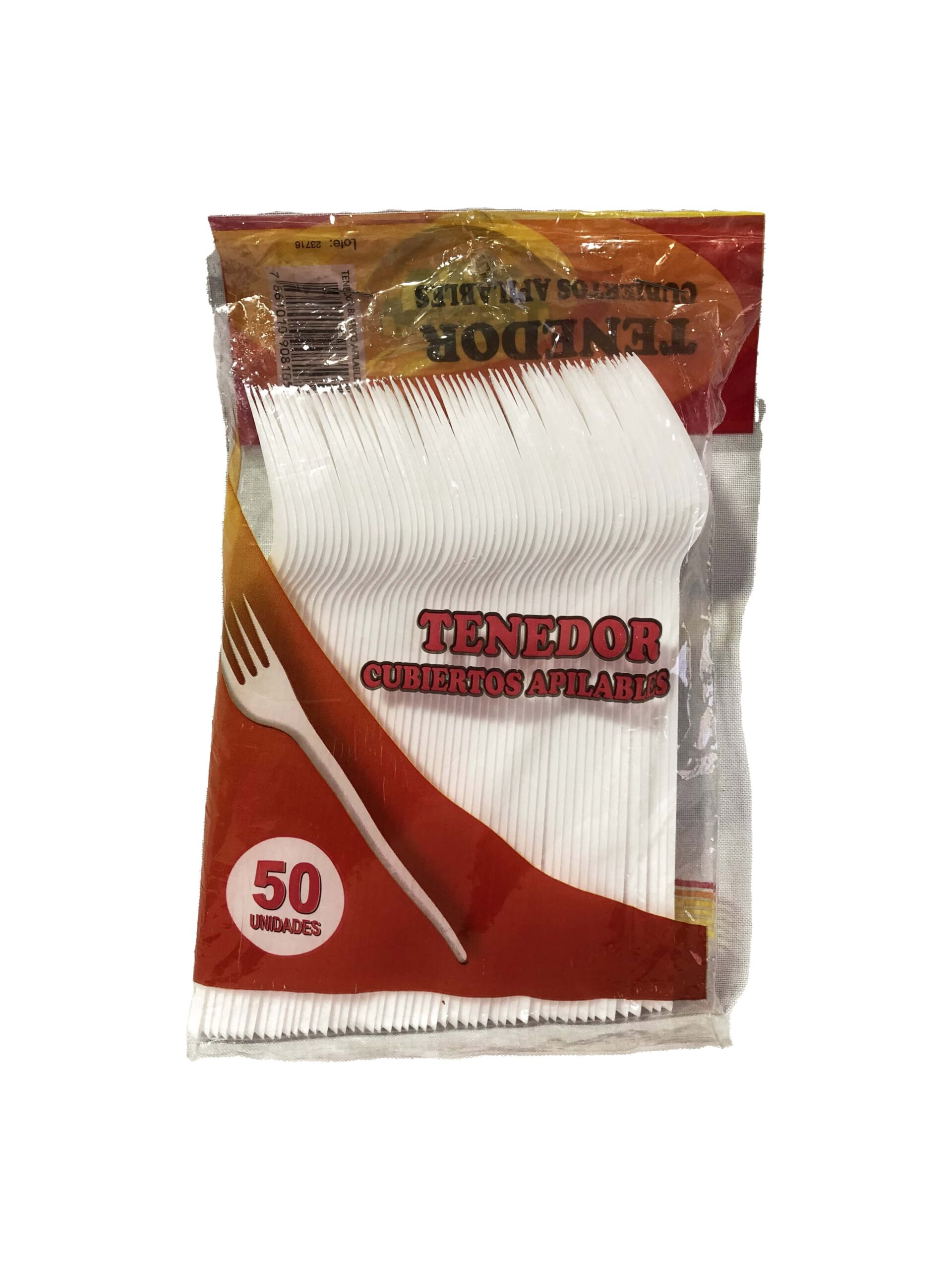 Tenedor blanco desechable, marca Plastiutil, funda con 50 unidades