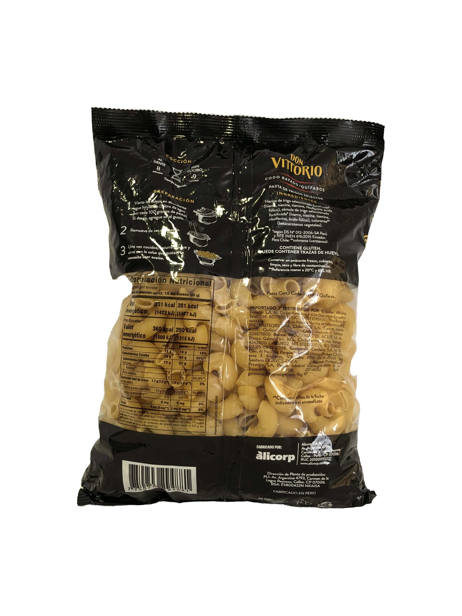 Fideo codo rayado marca Don Vittorio, funda de 400g